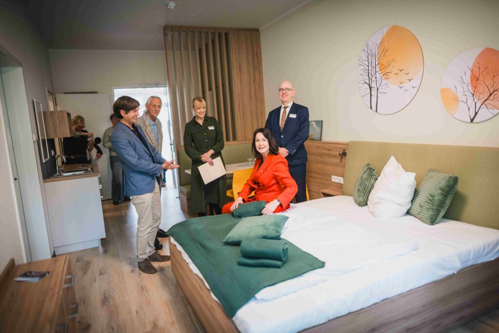 Mit der Förderung können wir unter anderem Akustikpaneele zur Geräuschdämmung, Sonnenschutzmarkisen für die Appartements sowie digitale Türterminals installieren. Auch der Fingerklemmschutz an Türen gehört zu den geplanten Verbesserungen – kleine Details, die im Alltag unserer Rehabilitandinnen und Rehabilitanden einen großen Unterschied machen.